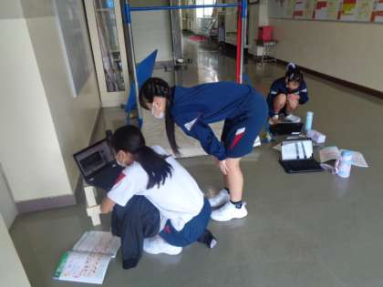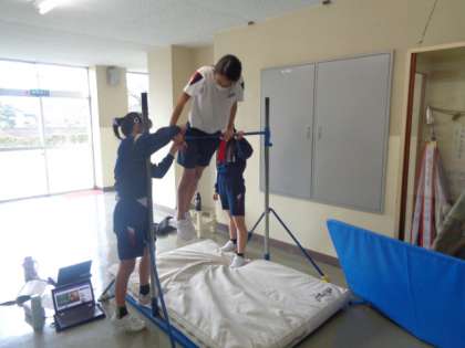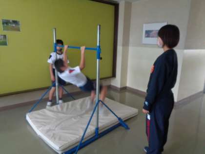 動画で技のポイントを確認しながら鉄棒の練習に取り組んでいます。友達からの声援も力になります。