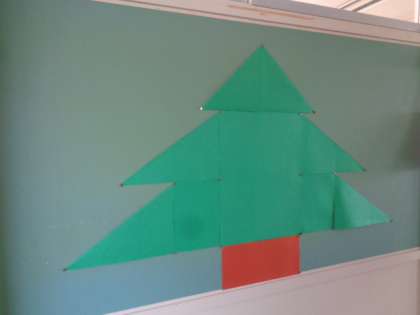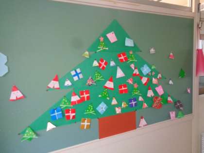 火曜日にたくさん作った折り紙のバーツが、クリスマスツリーに飾られ、素敵なツリーが完成していました。