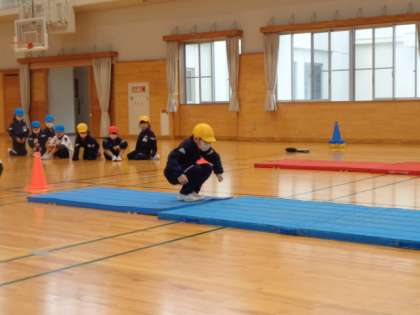 マット教室で教わったことを生かしてジャンプや回転技の練習をしています。友達のがんばりを応援しながら、上手に運動することができました。