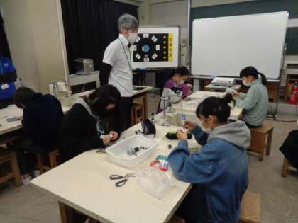 外部から講師の方々をお招きし、いろいろな実験を体験しました。6年生は「月の満ち欠け」です。手作りの実験道具で地球、月、太陽の位置関係を確認しながら明かりを照らすと、月の見え方とその理由がはっきりと分かりました。子供たちも納得の様子です。