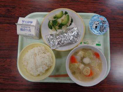 今日の献立は、ご飯 内豆汁 鯖の銀紙焼き かぶの彩り ヨーグルト 牛乳 でした。