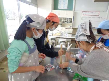 餅米は、すりこぎでこね、柔らかくした後、いろいろな餅作りに挑戦です。