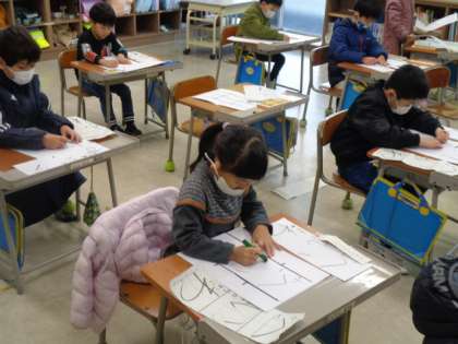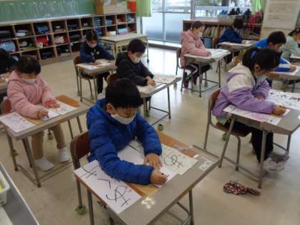 始業式の後、校内書き初め大会が行われました。1・2年生は教室で硬筆を、3年生は毛筆を行いました。冬休み中にたくさん練習した成果を見せようと、集中して参加していました。