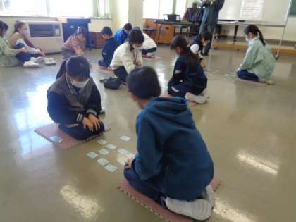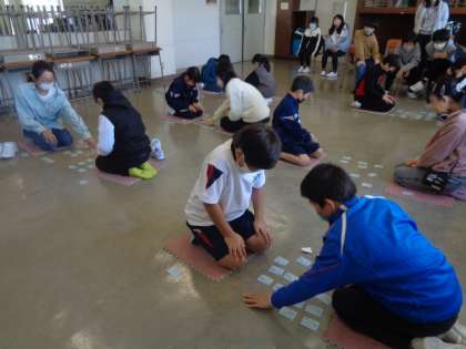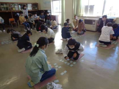 学年の枠を越え、温かな雰囲気の中、今までの練習の成果を発揮しようと真剣に取り札を競い合いました。上の句で素速く取る場面もしばしば。大いに盛り上がりました。