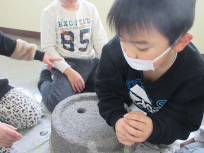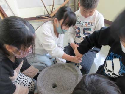 自分たちで育てて収穫した大豆を石臼で挽きました。