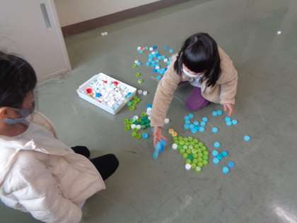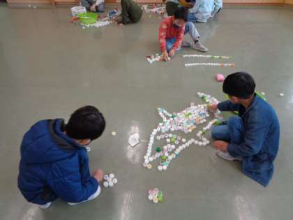 ペットボトルのキャップを組み合わせて、思い思いの形を作り上げています。