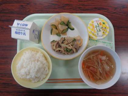 今日は、「ピーマンマンと夜ふかし大まおう」で献立は、ご飯、ピーマンマンの炒め物、かぶの中華和え、、春雨スープ、レモンムース 牛乳 でした。