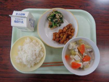 給食週間最終日。今日のテーマは「ふしぎ駄菓子屋 銭天堂」です。献立は、ご飯 塩麹鍋 底なしイ〜カビーンズ 忍者ジンジャーのおひたし 牛乳 でした。