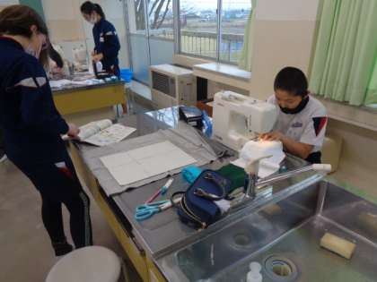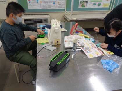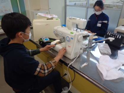 ミシンを使って雑巾作り。上糸と下糸のかけ方を慎重に行い、丁寧に作業しています。ボタン縫いにも挑戦しています