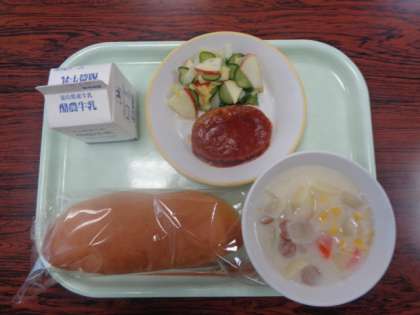 2月14日(火) 今日の給食 公開日 2023/02/14 更新日 2023/02/14 給食室から 今日の献立は、コッペパン ハンバーグのケチャップ煮 白菜とりんごのサラダ コーンチャウダー 牛乳 でした。