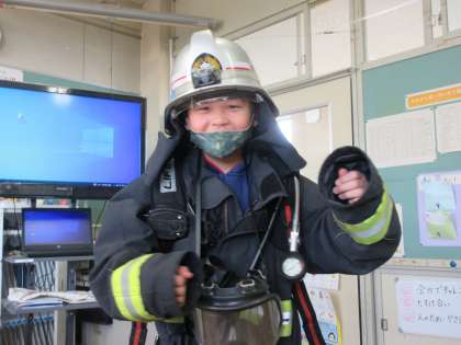 お話だけではなく、消防服を着たり、ホースを持ったりと、子供たちはとても楽しく学習していました。