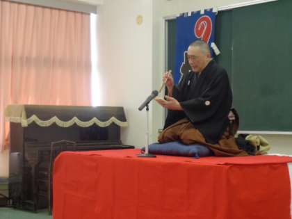 第2部も、小噺の体験からスタート。なかなかのしゃべり口でした。落語の道具である扇子や手拭いを巧みに使った仕草にも子供たちは感心しきり。夢中になった落語体験教室でした。