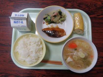 今日の献立は、ご飯 鰺のみりん焼き 豚汁 チンゲンサイソテー バナナ 牛乳 でした。