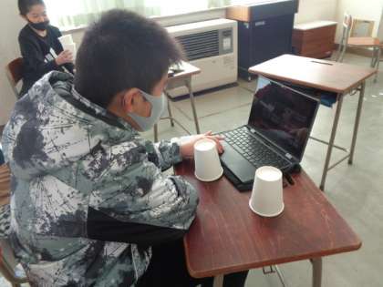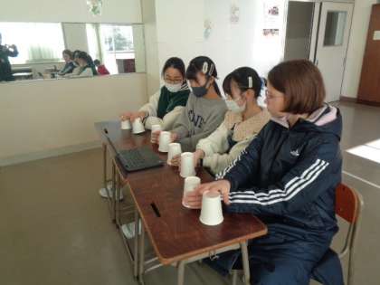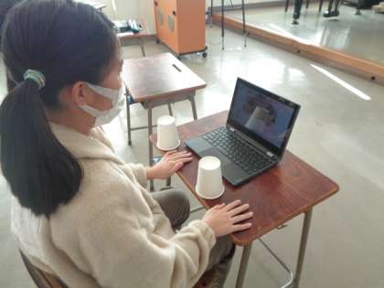 カップスを使ってリズム作りに挑戦しています。とても息が合っています。