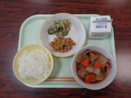 今日の献立は、ご飯  いかと里芋の煮物  フライビーンズ  ゆかり和え 牛乳  でした。