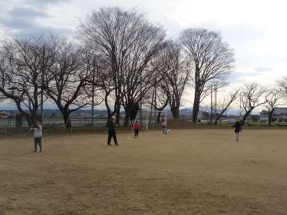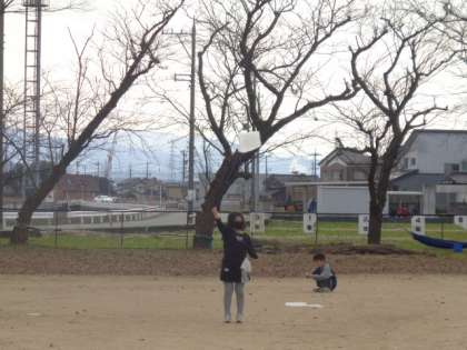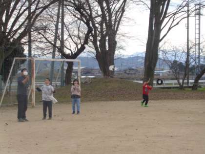 自分たちで作った凧を揚げています。強く風に苦戦しています。