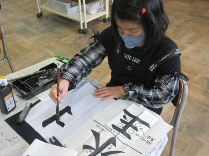 今まで習った、とめ・はね・はらいの書き方を生かしながら「水玉」の字を集中して書いていました。