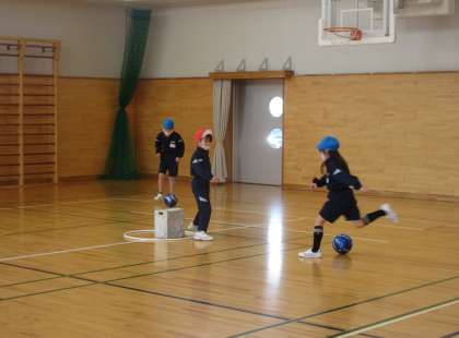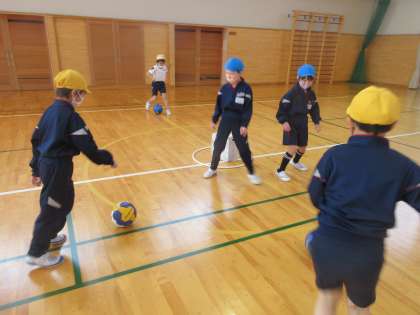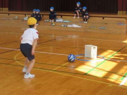 体育の学習では、「ボール蹴り遊び」をしています。相手チームが守る的をどれだけ倒せるか競います。