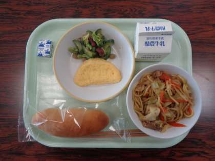 今日の献立は、コッペパン 焼きそば オムレツ ビーンズサラダ ポケットチーズ 牛乳 でした。