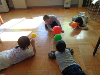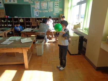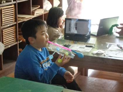 風船から送り出された空気の力で走る車を作り、動かしています。とても上手に作ることができました。
