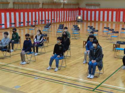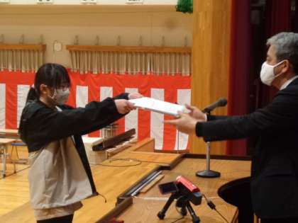 校長先生から6年生の代表の人へ修了証が手渡されました。いよいよ明日は卒業式。最後の晴れ舞台です。