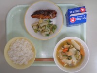 今日の献立は、ご飯 豚肉のキムチ炒め 中華かき玉汁 粉ふきいも 味付け小魚 牛乳 でした。