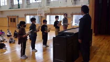 令和4年後の修了式が行われ、各学年の人たちが、堂々とした態度で校長先生から修了証を受け取りました。