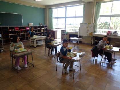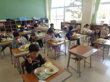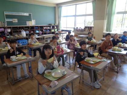 給食中は、作ってくださった方々への感謝の気持ちをもち、落ち着いて食べています。