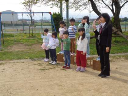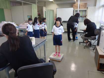 桜の木の下でのクラス写真や、保健室での発育測定。今日も1年生は行儀よく活動しています。