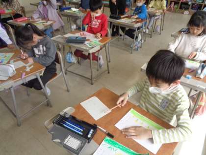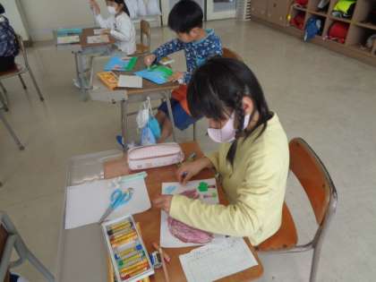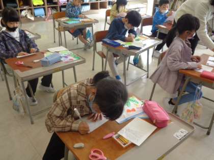 花見の絵を想像して、クレヨンで描いています。花や虫、木など、賑やかで楽しい花見の絵が広がっていました。