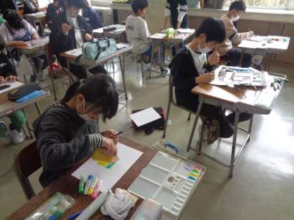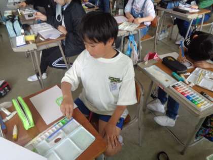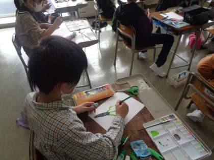 水の量を工夫して濃淡を表し、絵の具による表現の仕方を試しています。