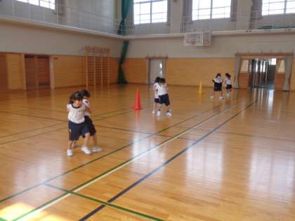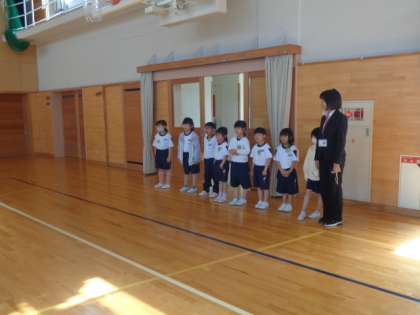体ほぐしの運動をしたり、かけっこをしたりして汗を流しした。学校探検で体育館に入ってきた1年生に、素速く並んで話を聞くお手本を見せることもできました。