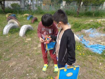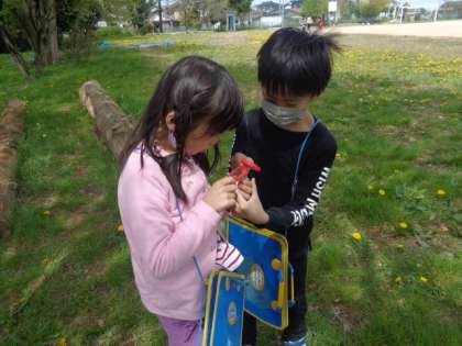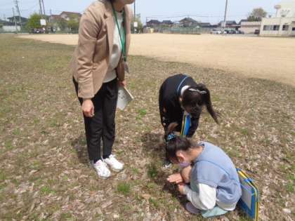 理科の学習で、グラウンドの様子を観察しました。きれいに咲き誇るタンポポや、静かなにたたずむカエルなど、暖かを感じるものもたくさんありました。