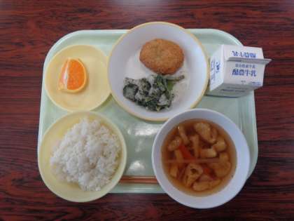 今日の献立は、ご飯 沢煮わん 豆をかぼちゃのコロッケ よごし 清美オレンジ 牛乳 でした。