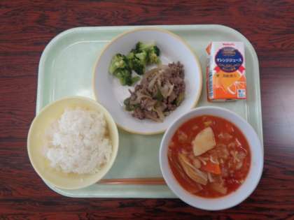 サミット給食の2回目。今日はアメリカ合衆国をテーマとした献立です。ご飯 アメリカンビーフソテー 白インゲン豆のトマト煮 添え野菜 オレンジジュース でした。