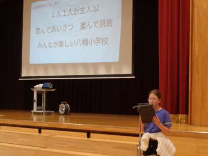 最後は、班ごとに記念撮影。児童会のスローガン「一人一人が主人公 進んであいさつ 進んで挑戦 みんなが楽しい八幡小学校」もと、今年度のなかよし班と児童会活動がスタートしました。