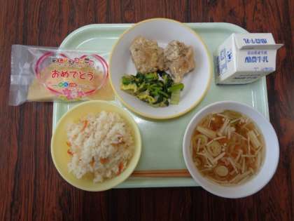 4月21日(金) 今日の給食 公開日 2023/04/21 更新日 2023/04/21 給食室から 今日は、入学お祝い献立です。ちらしずし 鶏肉の唐揚げ すまし汁 おひたし お祝いデザート 牛乳 でした。