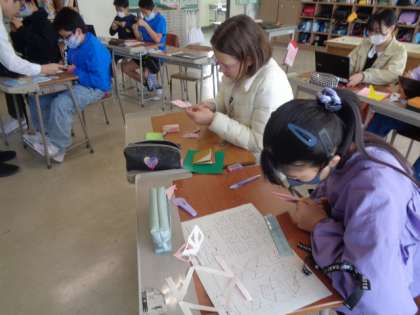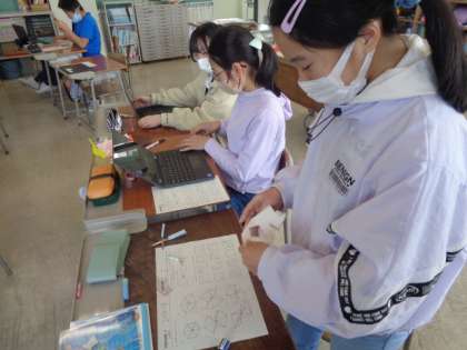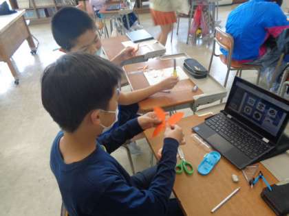 学習した線対称の形を折り紙に書き込み、切り取って広げると、素敵な模様が出来上がりました。