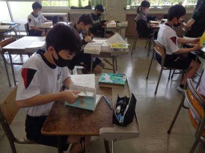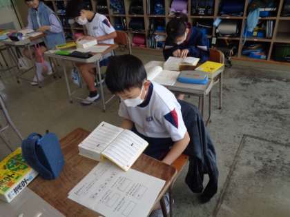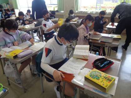 漢字の成り立ちについて漢字辞典を使いながら調べています。辞書の使い方を確かめ合いながら、集中して学習に取り組んでいます。