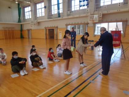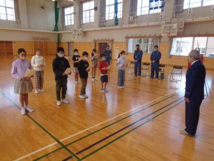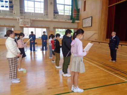 富山北消防署和合出張所の所長さんを招待し、BFCバッジ授与式を行いました。少年消防クラブの一員として、火事の予防に努め、絶対に起こさないことを強く誓います。