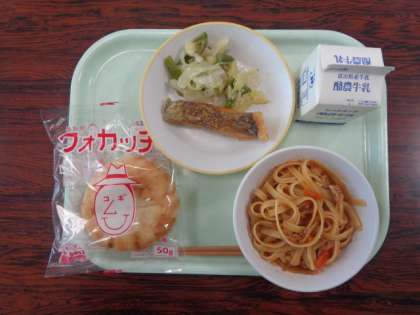 今日は、サミット給食の4回目。テーマは「イタリア」です。フォカッチャ ラグー・アッラ・ボロネーゼ ホキのイタリアレモンソースがけ グリーンアスパラのコントルノ 牛乳 でした。