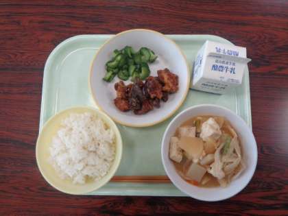 今日の献立は、ご飯 ごまけんちん 豚肉とレバーの揚げからめ きゅうりもみ 牛乳 でした。