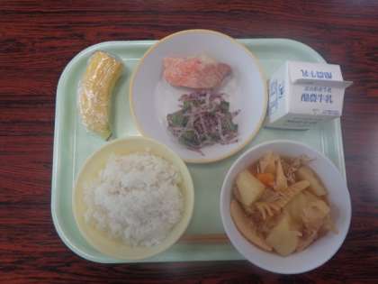 今日の献立は、ご飯 豚肉とじゃがいものうま煮 赤魚の塩焼き ゆかり和え バナナ 牛乳 でした。