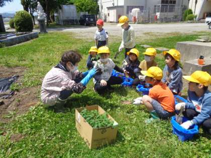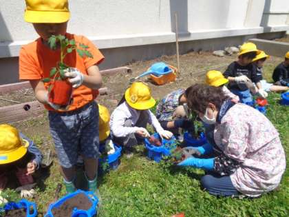 地域の岡本さんに教えて頂きながら、野菜の苗を植えました。畑に植えたのは自分で選んだ野菜の苗、植木鉢に植えたのはミニトマトです。しっかりとお世話をしながら大切に育てたいです。