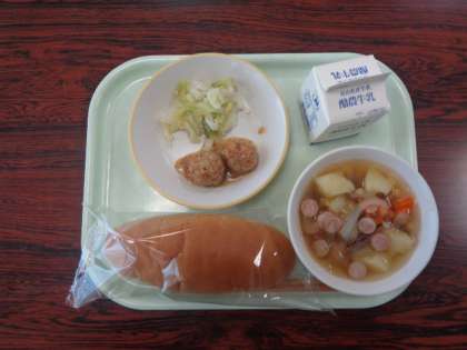 今日は、サミット給食の6回目。テーマは「ドイツ」です。献立は、ライ麦パン フリカデレ(ドイツ風一口ハンバーグ アイントプフ(具だくさんスープ) ザワークラフト 牛乳 でした。