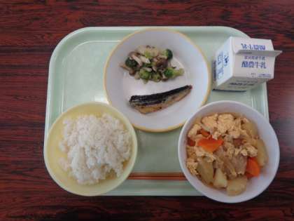 今日の献立は、ご飯 卵とじ 鰯のピリ辛煮 ブロッコリーときのこのソテー 牛乳 でした。