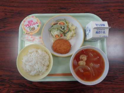 今日は、サミット給食の7回目で最終回。テーマは「フランス」です。献立は、ご飯 ブイヤベース チーズクロケット ジュリエンヌサラダ ブラマンジェ 牛乳 でした。
