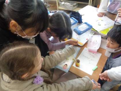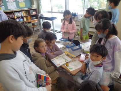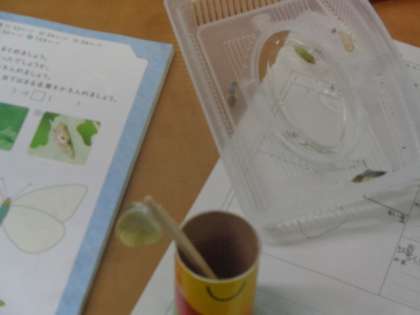 授業中に何と、モンシロチョウが羽化しました。その瞬間の子供たちの顔には驚きと感動の表情が広がっていました。これから羽を跳び立とうとする姿を、見守っていました。