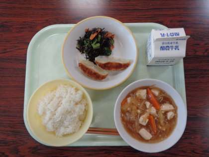 今日の献立は、ご飯  豆腐の野菜あんかけ  焼き餃子  ひじきのごま和え  牛乳  でした。