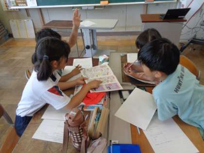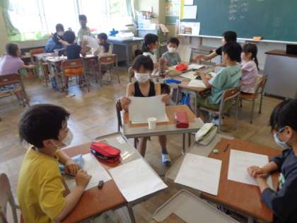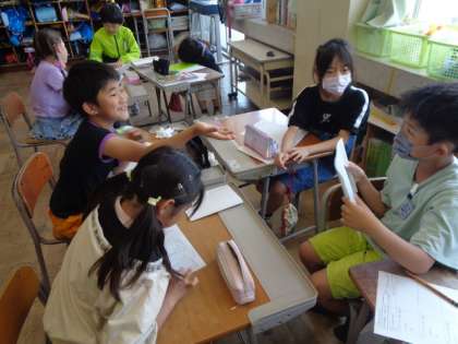 グループごとに、4W1Hの内容を確認しながら自己紹介文をつくって発表したり、質問文を考えたりしています。